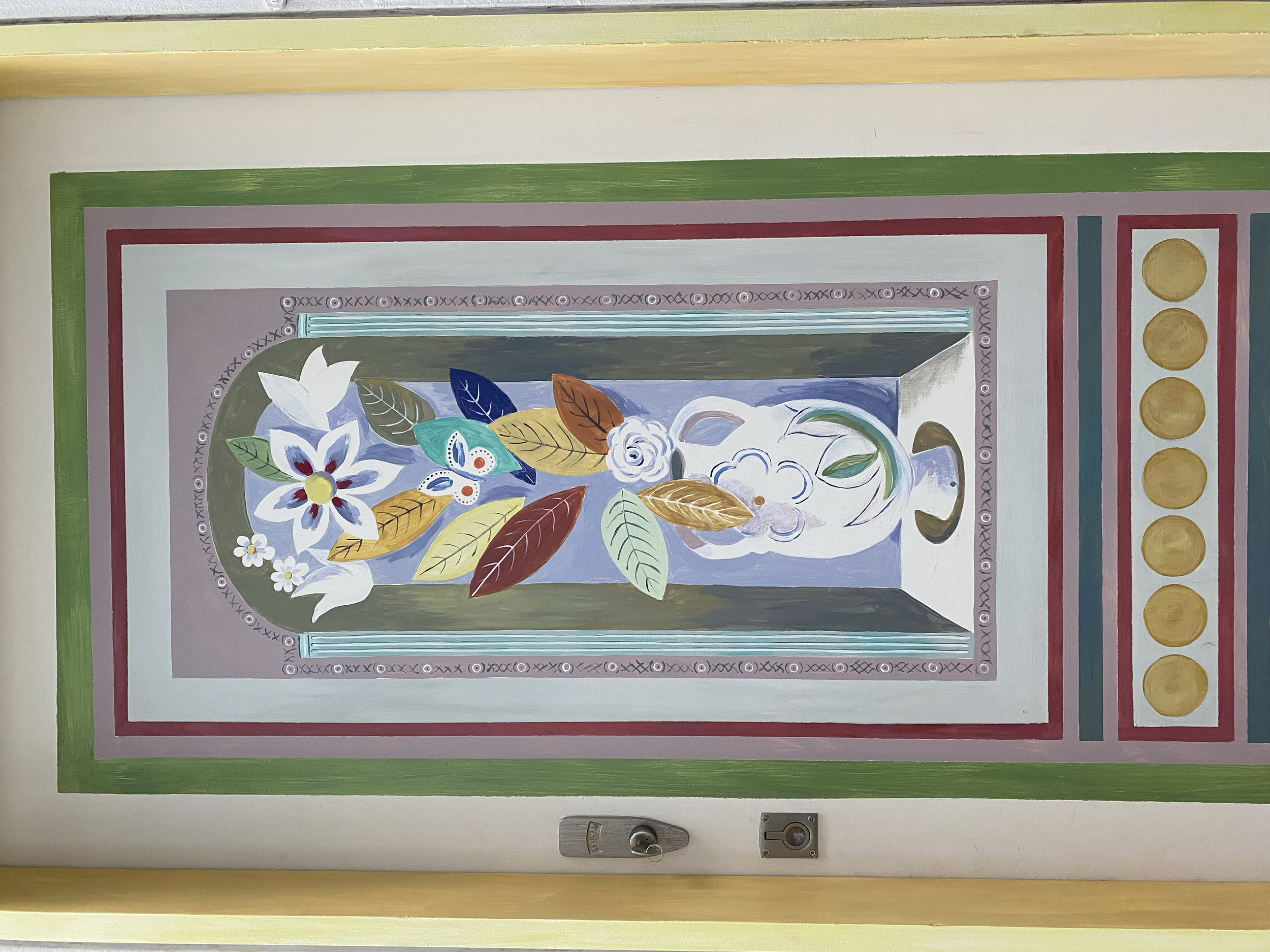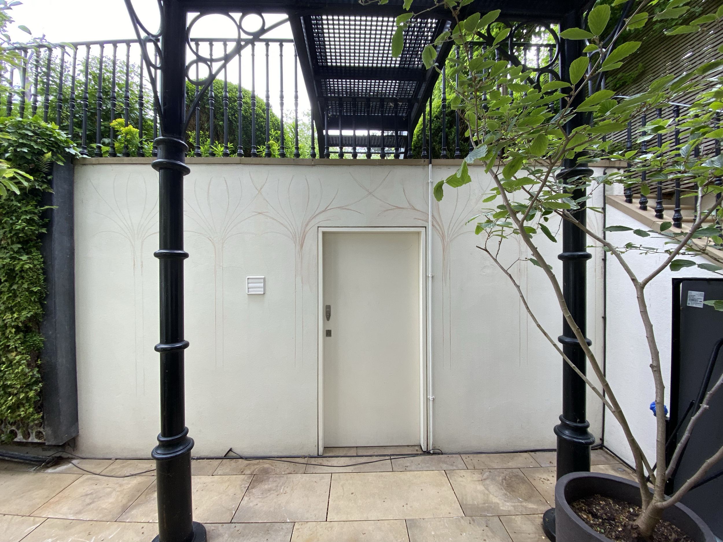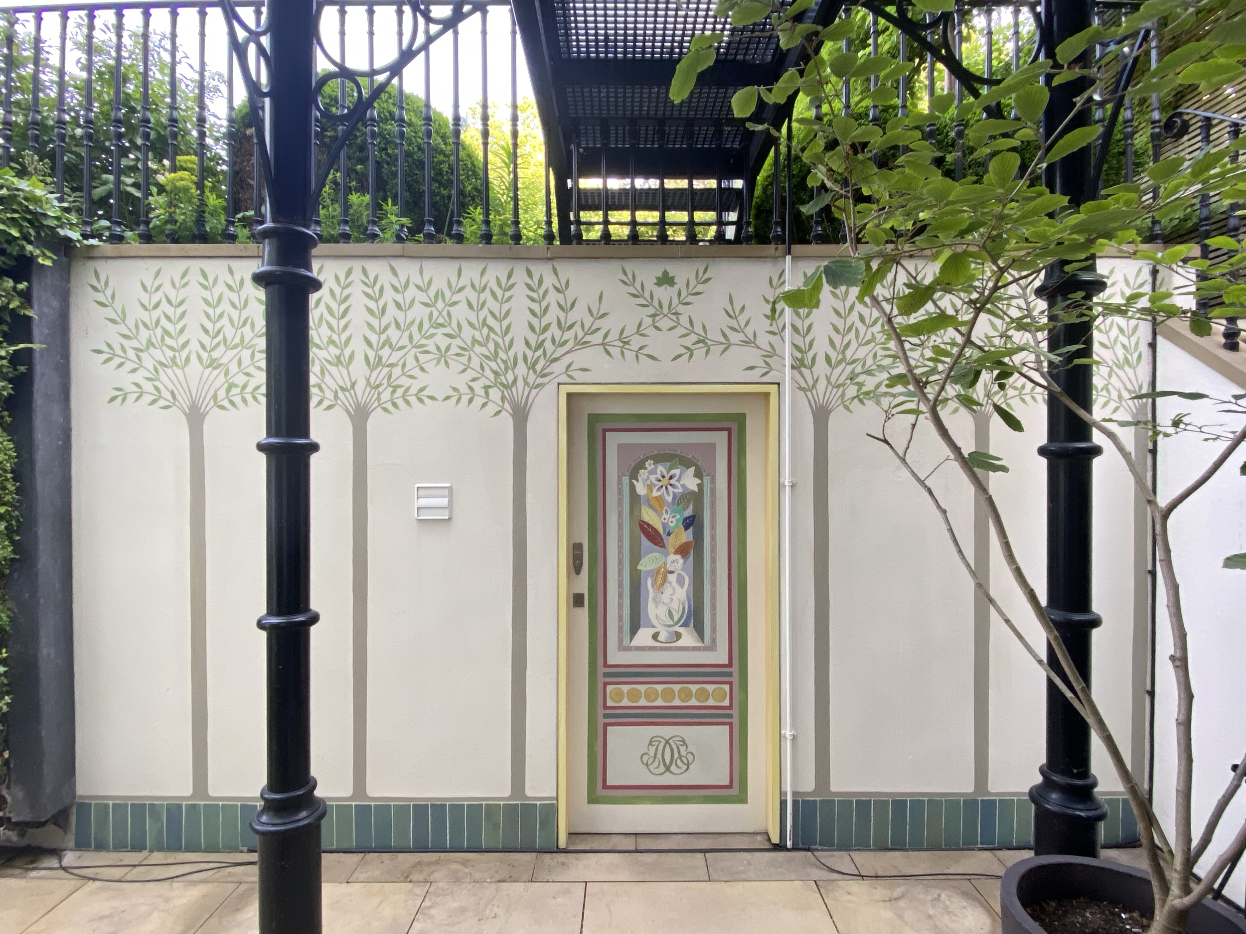 This was such a wonderful commission from a friend to cheer up a rather boring outside wall in an otherwise ravishing garden with espaliered trees, a fountain, a green wall and numerous plants. The lower terrace is accessed either by steps or through the lower ground floor bedroom and TV room. The former is bedecked with paintings and plates by the Bloomsbury set and the walls are painted in the signature blue and pink of Berwick church, decorated by Vanessa Bell and Duncan Grant. I visited Charleston to immerse myself in their colours and shapes. I then enjoyed chatting to my client to see how the mural could reflect her late American husband, who had rescued the New York Parks (hence the maple leaf motif) and then gone on to head up Coutts. I was blessed with beautiful May weather and enjoyed painting numerous leaves in Edward Bulmer’s Invisible Green and otherwise used Mylands exterior water based eggshells - which come in good sized small tins, which were the basis for my palette. Later I sourced another Duncan Grant landscape and added this to the collection of paintings in the bedroom.