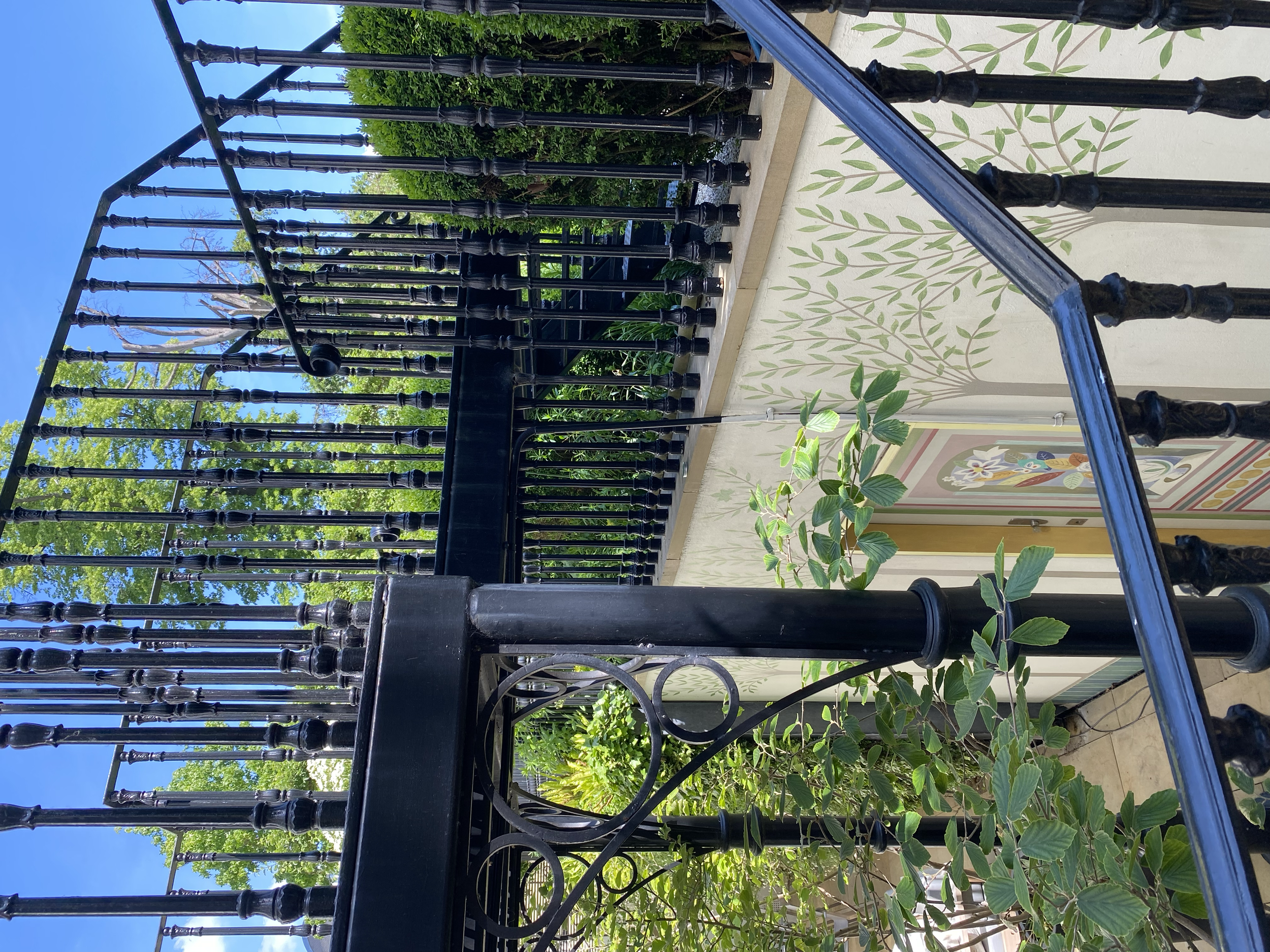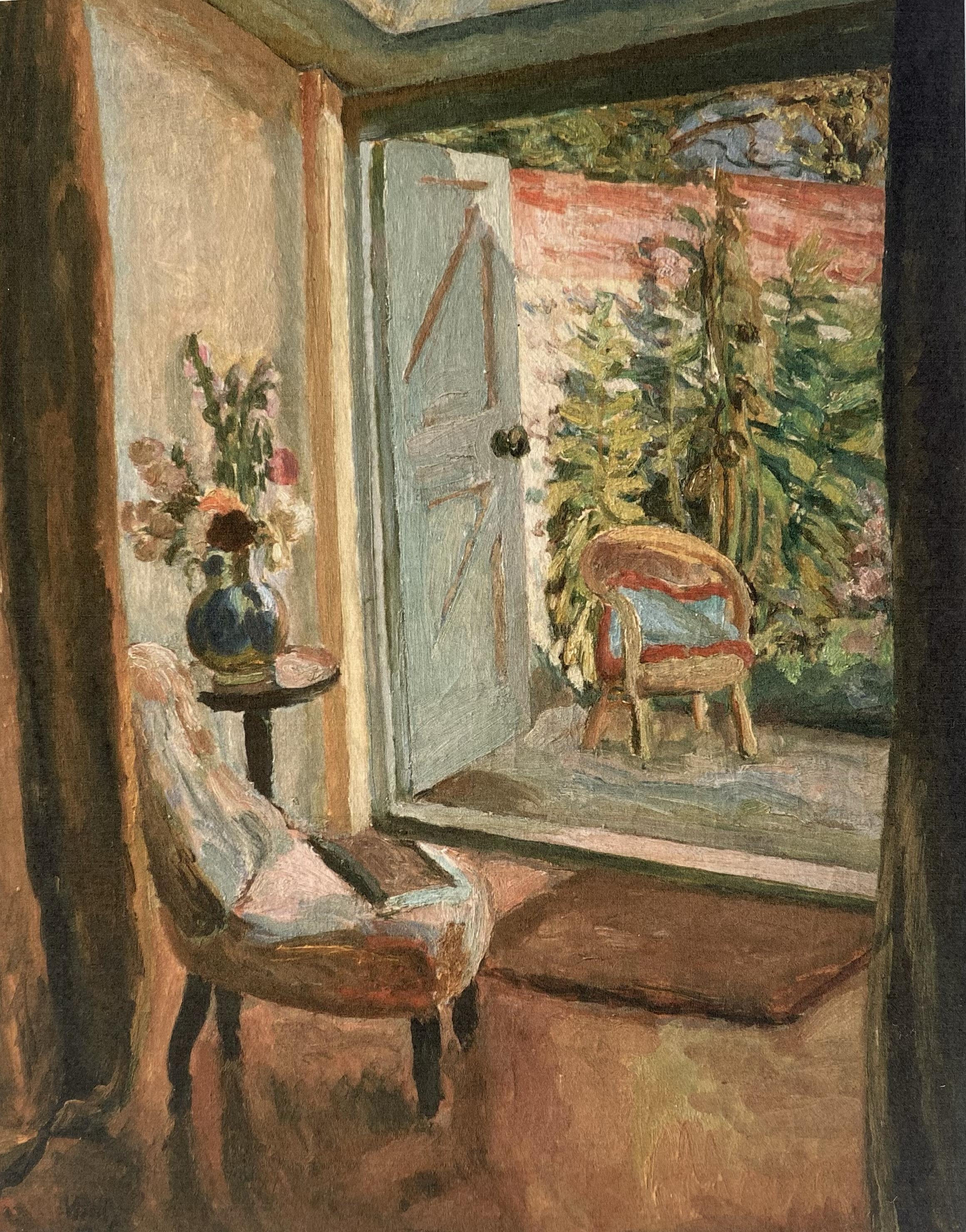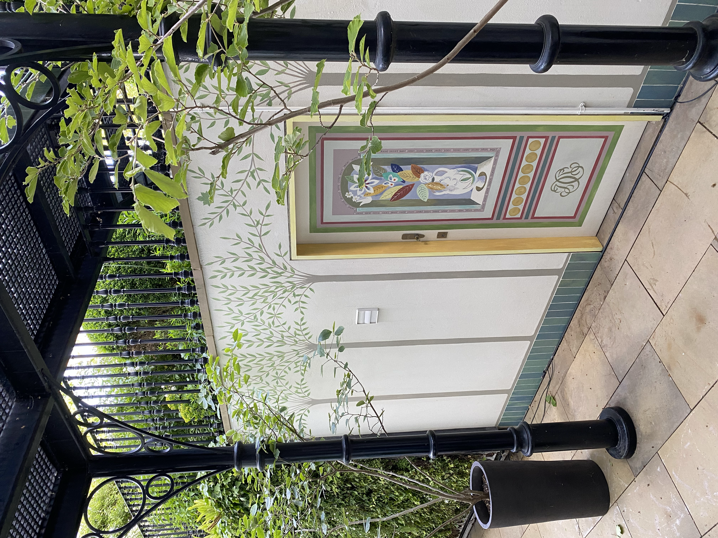 This was such a wonderful commission from a friend to cheer up a rather boring outside wall in an otherwise ravishing garden with espaliered trees, a fountain, a green wall and numerous plants. The lower terrace is accessed either by steps or through the lower ground floor bedroom and TV room. The former is bedecked with paintings and plates by the Bloomsbury set and the walls are painted in the signature blue and pink of Berwick church, decorated by Vanessa Bell and Duncan Grant. I visited Charleston to immerse myself in their colours and shapes. I then enjoyed chatting to my client to see how the mural could reflect her late American husband, who had rescued the New York Parks (hence the maple leaf motif) and then gone on to head up Coutts. I was blessed with beautiful May weather and enjoyed painting numerous leaves in Edward Bulmer’s Invisible Green and otherwise used Mylands exterior water based eggshells - which come in good sized small tins, which were the basis for my palette. Later I sourced another Duncan Grant landscape and added this to the collection of paintings in the bedroom.